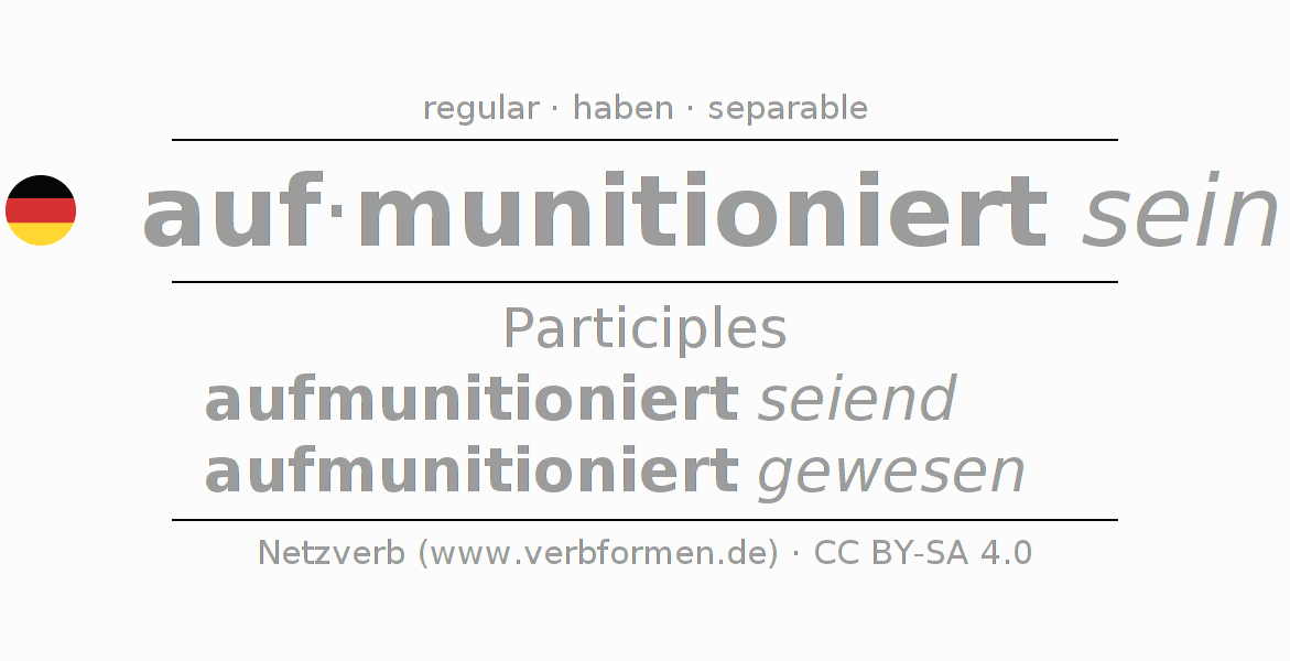 The conjugation of aufmunitionieren in Participle Present Perfect part of speech Statal Passive is aufmunitioniert seiend, aufmunitioniert gewesen.The conjugation corresponds to certain grammatical rules. Likewise the requirements for the conjugation of the simple verb forms of aufmunitionieren in Participle. Comments ☆