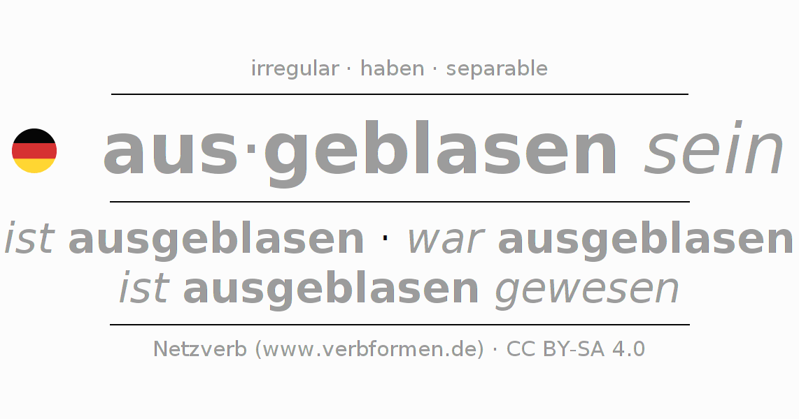 The conjugation of ausblasen in Participle Present Perfect part of speech Statal Passive is ausgeblasen seiend, ausgeblasen gewesen.The conjugation corresponds to certain grammatical rules. Likewise the requirements for the conjugation of the simple verb forms of ausblasen in Participle. Comments ☆