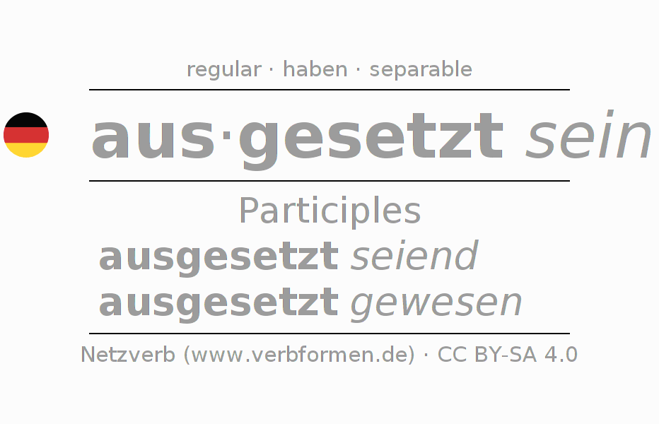 The conjugation of aussetzen in Participle Present Perfect part of speech Statal Passive is ausgesetzt seiend, ausgesetzt gewesen.The conjugation corresponds to certain grammatical rules. Likewise the requirements for the conjugation of the simple verb forms of aussetzen in Participle. Comments ☆