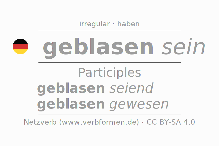 The conjugation of blasen in Participle Present Perfect part of speech Statal Passive is geblasen seiend, geblasen gewesen.The conjugation corresponds to certain grammatical rules. Likewise the requirements for the conjugation of the simple verb forms of blasen in Participle. 1Comment ☆5.0