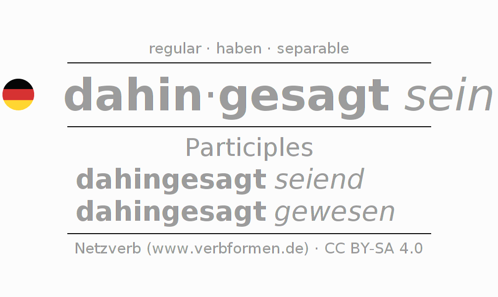 The conjugation of dahinsagen in Participle Present Perfect part of speech Statal Passive is dahingesagt seiend, dahingesagt gewesen.The conjugation corresponds to certain grammatical rules. Likewise the requirements for the conjugation of the simple verb forms of dahinsagen in Participle. Comments ☆