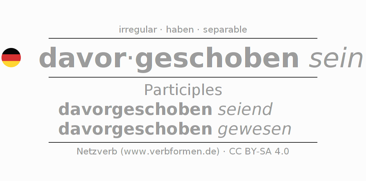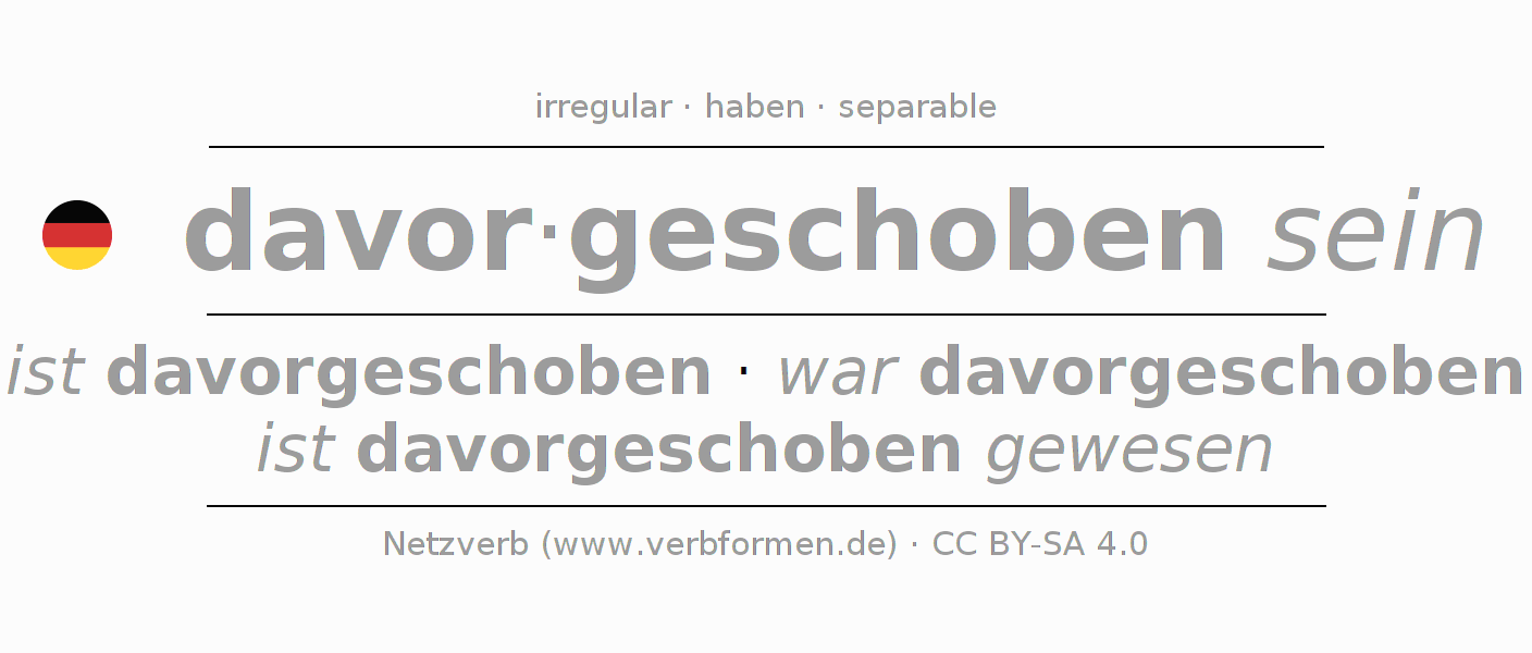 The conjugation of davorschieben in Participle Present Perfect part of speech Statal Passive is davorgeschoben seiend, davorgeschoben gewesen.The conjugation corresponds to certain grammatical rules. Likewise the requirements for the conjugation of the simple verb forms of davorschieben in Participle. Comments ☆