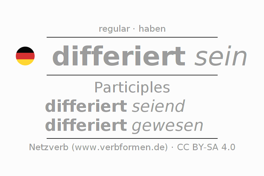 The conjugation of differieren in Participle Present Perfect part of speech Statal Passive is differiert seiend, differiert gewesen.The conjugation corresponds to certain grammatical rules. Likewise the requirements for the conjugation of the simple verb forms of differieren in Participle. Comments ☆