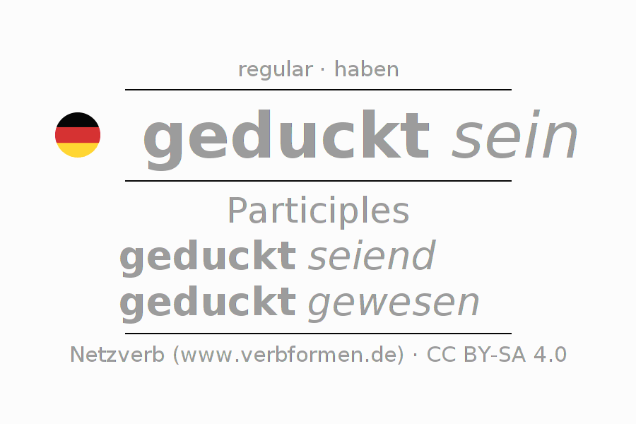 The conjugation of ducken in Participle Present Perfect part of speech Statal Passive is geduckt seiend, geduckt gewesen.The conjugation corresponds to certain grammatical rules. Likewise the requirements for the conjugation of the simple verb forms of ducken in Participle. Comments ☆