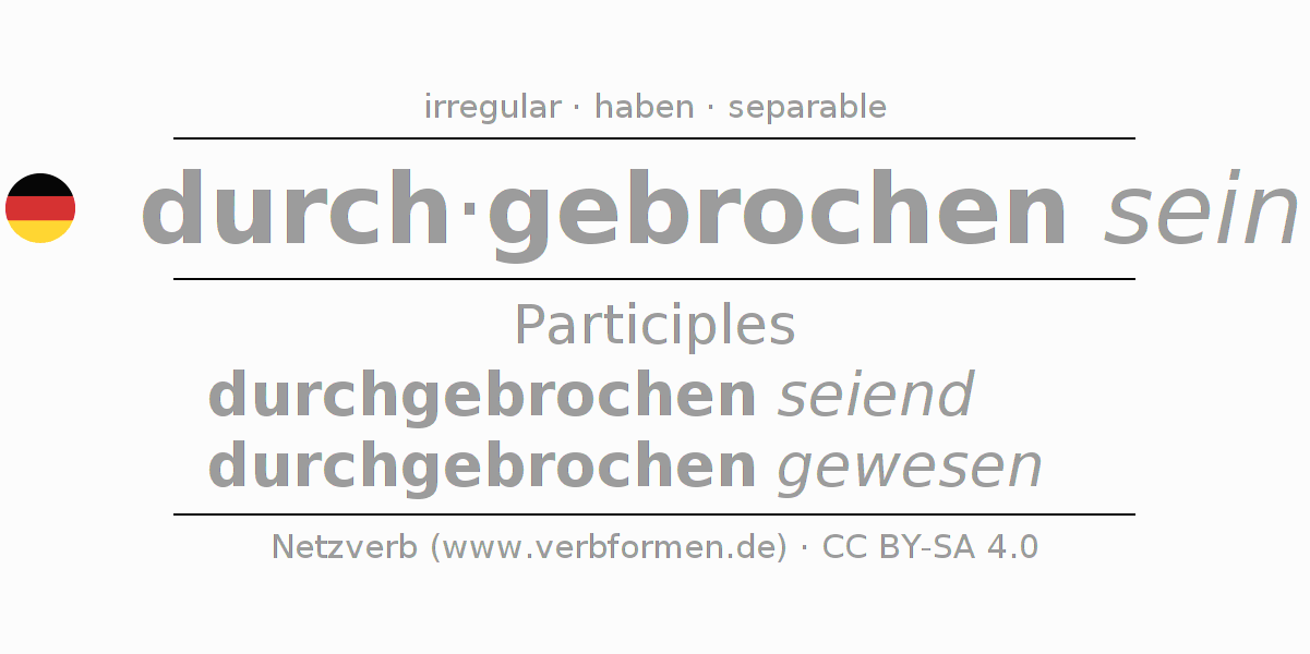 The conjugation of durchbrechen in Participle Present Perfect part of speech Statal Passive is durchgebrochen seiend, durchgebrochen gewesen.The conjugation corresponds to certain grammatical rules. Likewise the requirements for the conjugation of the simple verb forms of durchbrechen in Participle. Comments ☆