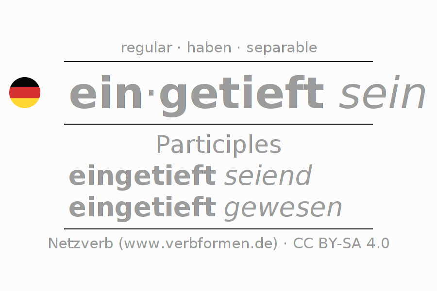 The verb eintiefen fully conjugated in all persons and numbers in the Participle Present Perfect
