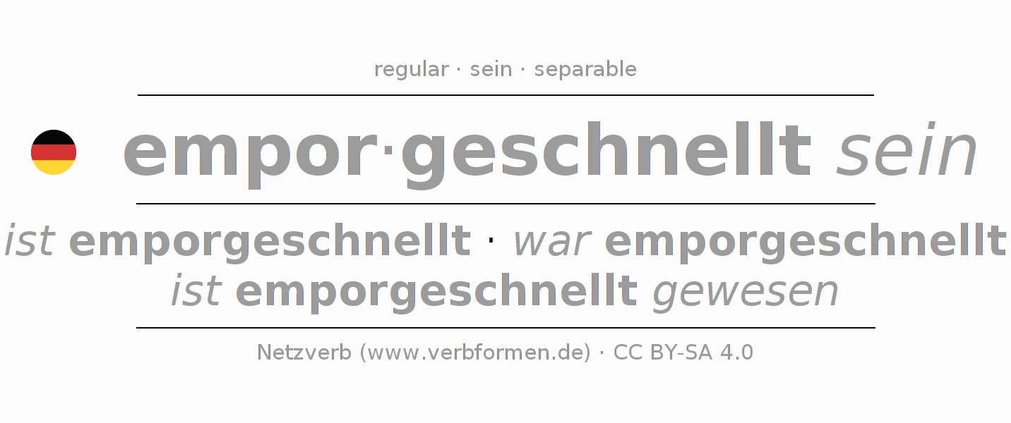 The conjugation of emporschnellen in Participle Present Perfect part of speech Statal Passive is emporgeschnellt seiend, emporgeschnellt gewesen.The conjugation corresponds to certain grammatical rules. Likewise the requirements for the conjugation of the simple verb forms of emporschnellen in Participle. Comments ☆