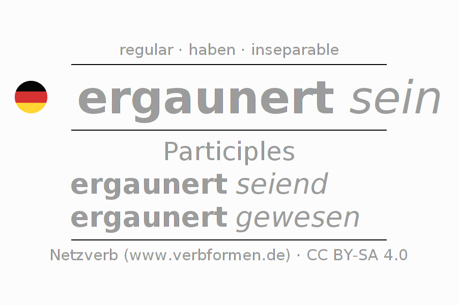 The conjugation of ergaunern in Participle Present Perfect part of speech Statal Passive is ergaunert seiend, ergaunert gewesen.The conjugation corresponds to certain grammatical rules. Likewise the requirements for the conjugation of the simple verb forms of ergaunern in Participle. Comments ☆