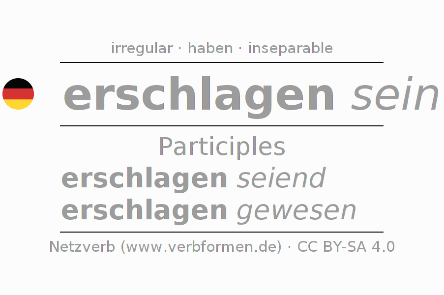 The conjugation of erschlagen in Participle Present Perfect part of speech Statal Passive is erschlagen seiend, erschlagen gewesen.The conjugation corresponds to certain grammatical rules. Likewise the requirements for the conjugation of the simple verb forms of erschlagen in Participle. Comments ☆