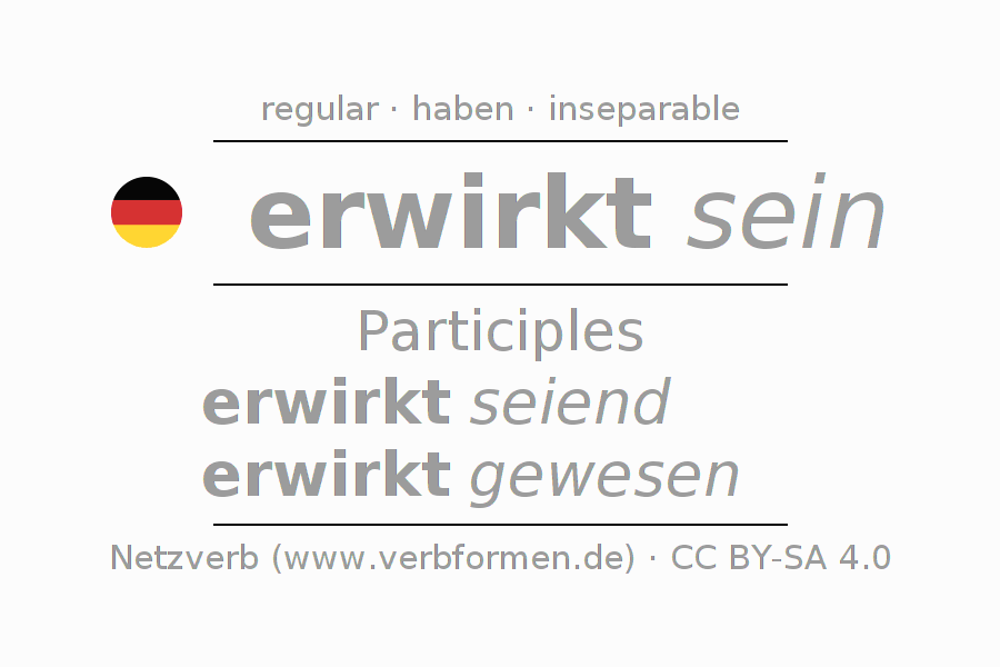The conjugation of erwirken in Participle Present Perfect part of speech Statal Passive is erwirkt seiend, erwirkt gewesen.The conjugation corresponds to certain grammatical rules. Likewise the requirements for the conjugation of the simple verb forms of erwirken in Participle. Comments ☆