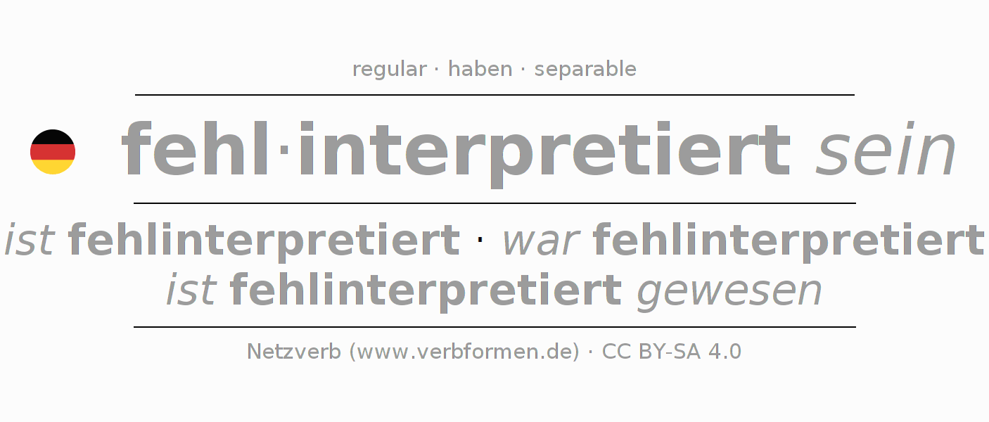 The conjugation of fehlinterpretieren in Participle Present Perfect part of speech Statal Passive is fehlinterpretiert seiend, fehlinterpretiert gewesen.The conjugation corresponds to certain grammatical rules. Likewise the requirements for the conjugation of the simple verb forms of fehlinterpretieren in Participle. Comments ☆