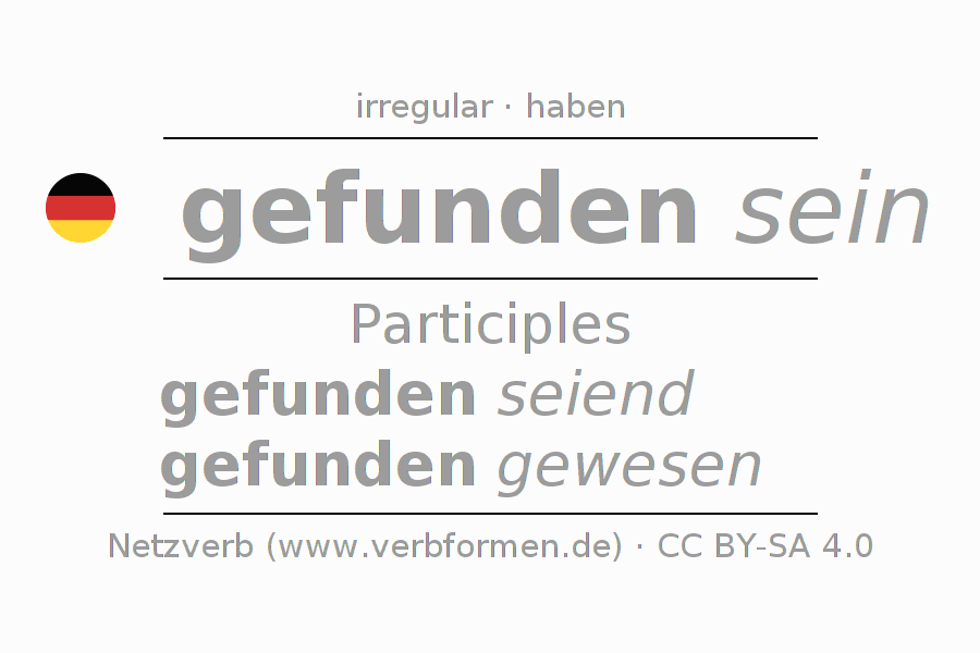The conjugation of finden in Participle Present Perfect part of speech Statal Passive is gefunden seiend, gefunden gewesen.The conjugation corresponds to certain grammatical rules. Likewise the requirements for the conjugation of the simple verb forms of finden in Participle. 1Comment ☆5.0