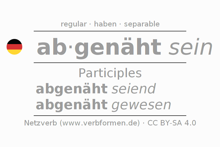 The conjugation of abnähen in Participle Present Perfect part of speech Statal Passive is abgenäht seiend, abgenäht gewesen.The conjugation corresponds to certain grammatical rules. Likewise the requirements for the conjugation of the simple verb forms of abnähen in Participle. Comments ☆