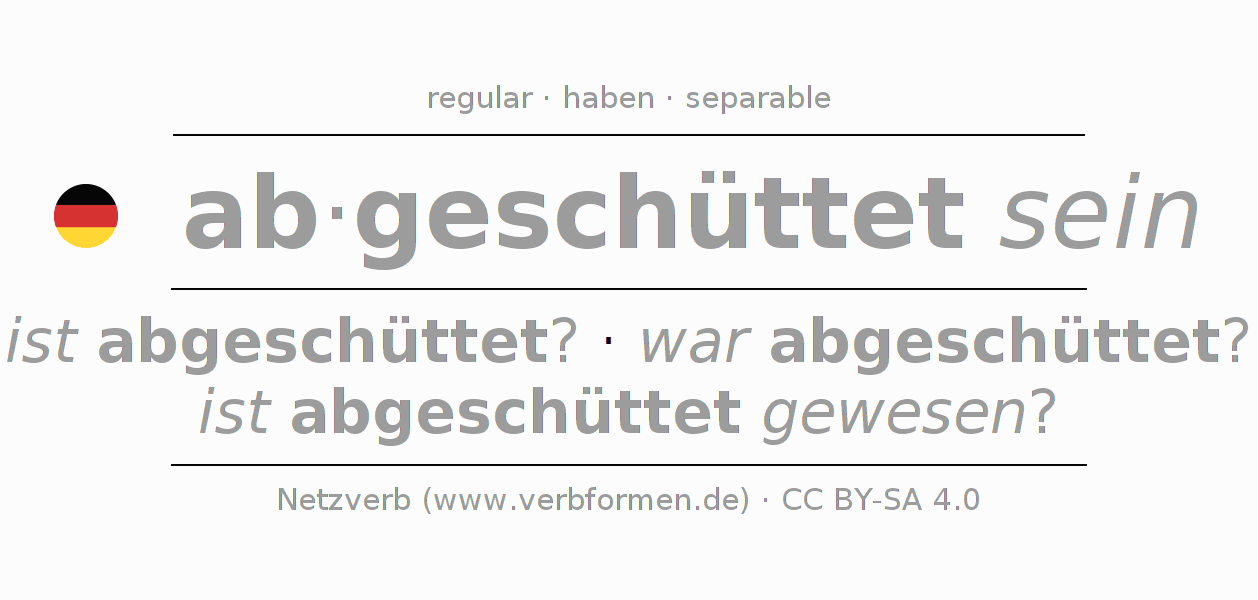 The conjugation of abschütten in Participle Present Perfect part of speech Statal Passive is abgeschüttet seiend, abgeschüttet gewesen.The conjugation corresponds to certain grammatical rules. Likewise the requirements for the conjugation of the simple verb forms of abschütten in Participle. Comments ☆