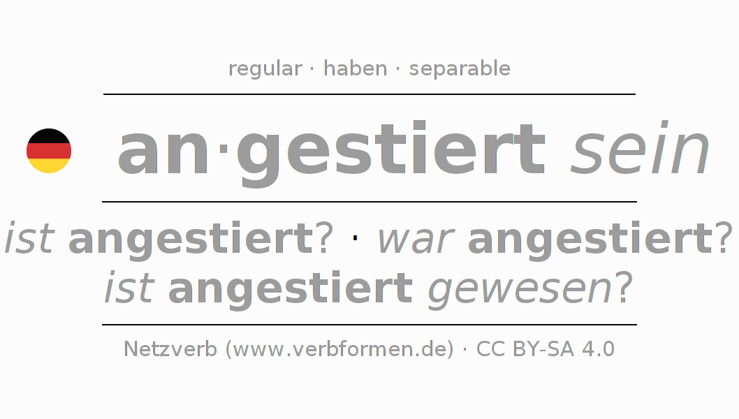The conjugation of anstieren in Participle Present Perfect part of speech Statal Passive is angestiert seiend, angestiert gewesen.The conjugation corresponds to certain grammatical rules. Likewise the requirements for the conjugation of the simple verb forms of anstieren in Participle. Comments ☆