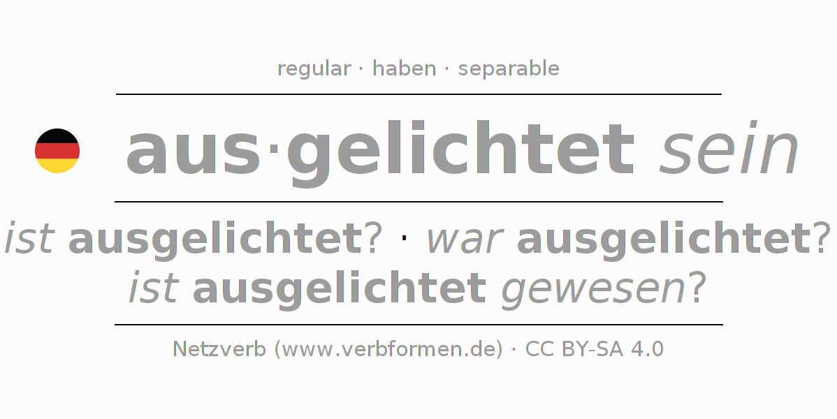 The conjugation of auslichten in Participle Present Perfect part of speech Statal Passive is ausgelichtet seiend, ausgelichtet gewesen.The conjugation corresponds to certain grammatical rules. Likewise the requirements for the conjugation of the simple verb forms of auslichten in Participle. Comments ☆