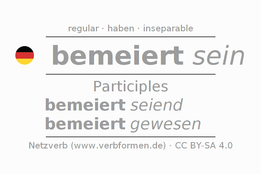 The conjugation of bemeiern in Participle Present Perfect part of speech Statal Passive is bemeiert seiend, bemeiert gewesen.The conjugation corresponds to certain grammatical rules. Likewise the requirements for the conjugation of the simple verb forms of bemeiern in Participle. Comments ☆