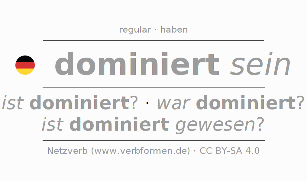 The conjugation of dominieren in Participle Present Perfect part of speech Statal Passive is dominiert seiend, dominiert gewesen.The conjugation corresponds to certain grammatical rules. Likewise the requirements for the conjugation of the simple verb forms of dominieren in Participle. Comments ☆