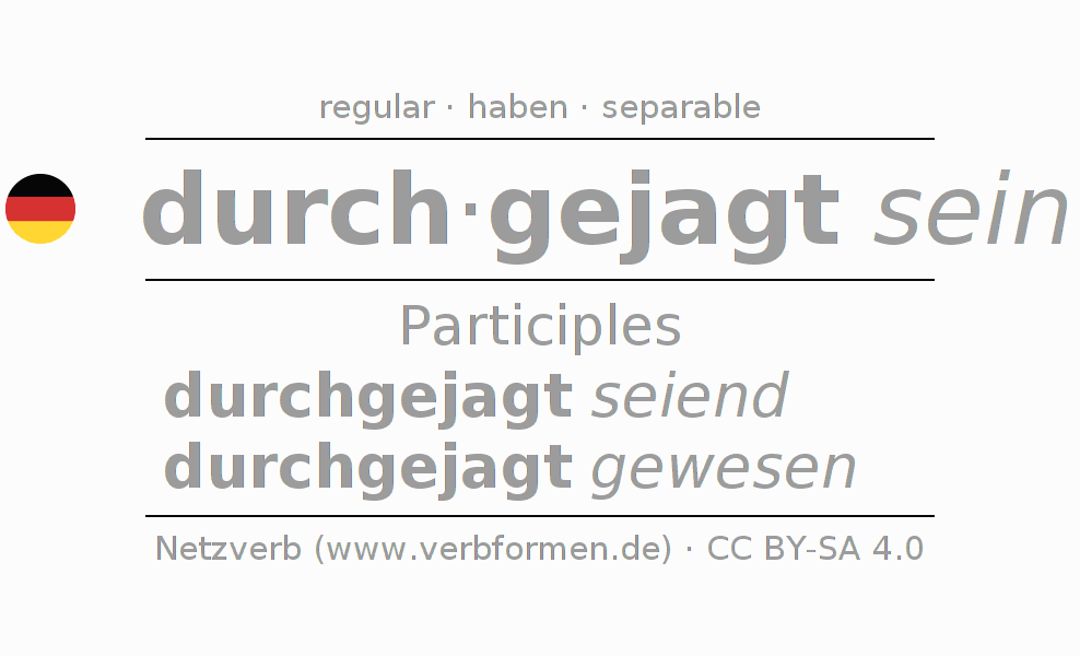 The conjugation of durchjagen in Participle Present Perfect part of speech Statal Passive is durchgejagt seiend, durchgejagt gewesen.The conjugation corresponds to certain grammatical rules. Likewise the requirements for the conjugation of the simple verb forms of durchjagen in Participle. Comments ☆