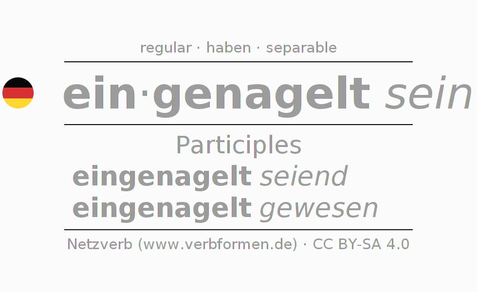 The conjugation of einnageln in Participle Present Perfect part of speech Statal Passive is eingenagelt seiend, eingenagelt gewesen.The conjugation corresponds to certain grammatical rules. Likewise the requirements for the conjugation of the simple verb forms of einnageln in Participle. Comments ☆