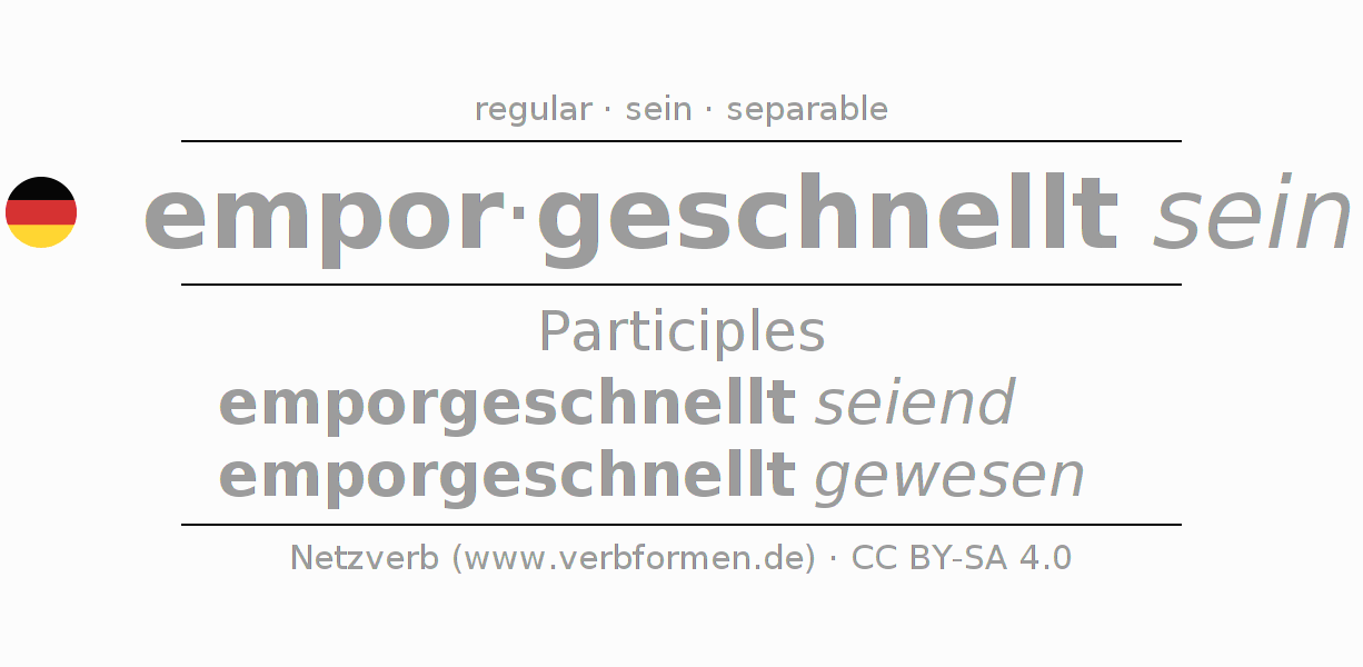 The conjugation of emporschnellen in Participle Present Perfect part of speech Statal Passive is emporgeschnellt seiend, emporgeschnellt gewesen.The conjugation corresponds to certain grammatical rules. Likewise the requirements for the conjugation of the simple verb forms of emporschnellen in Participle. Comments ☆