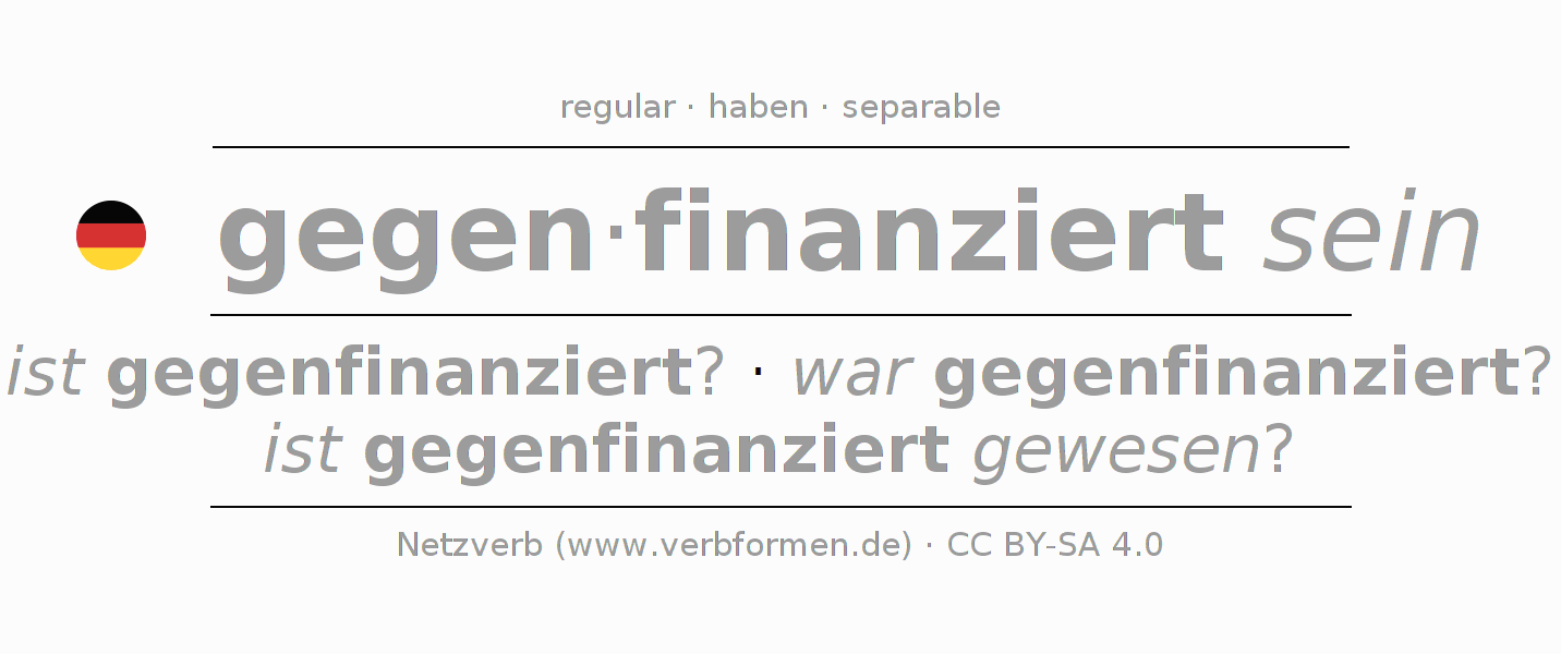 The conjugation of gegenfinanzieren in Participle Present Perfect part of speech Statal Passive is gegenfinanziert seiend, gegenfinanziert gewesen.The conjugation corresponds to certain grammatical rules. Likewise the requirements for the conjugation of the simple verb forms of gegenfinanzieren in Participle. Comments ☆