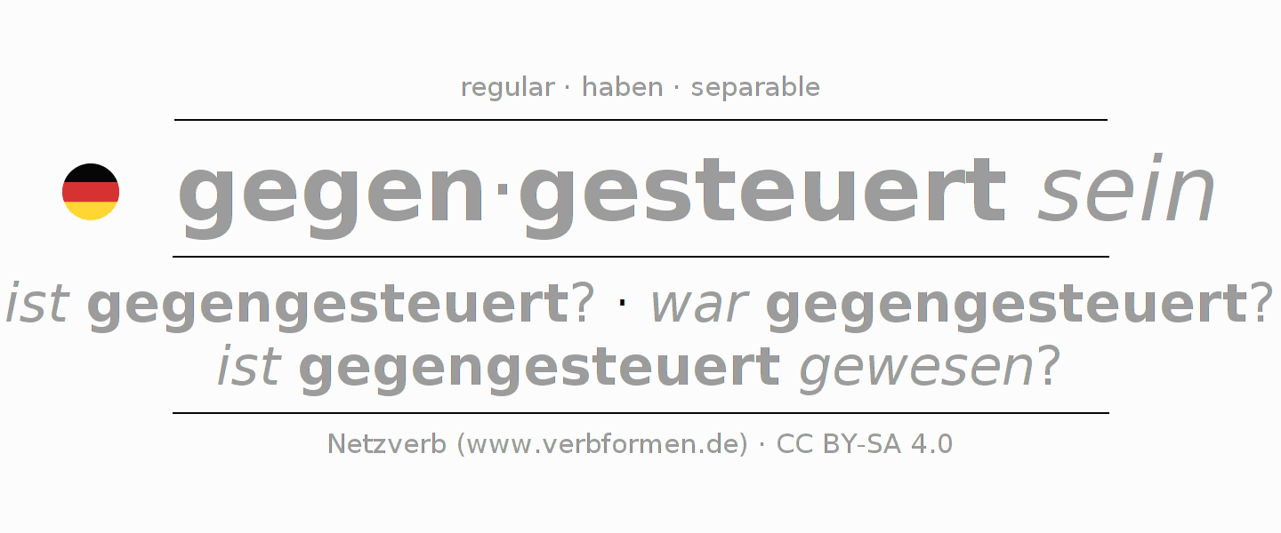The conjugation of gegensteuern in Participle Present Perfect part of speech Statal Passive is gegengesteuert seiend, gegengesteuert gewesen.The conjugation corresponds to certain grammatical rules. Likewise the requirements for the conjugation of the simple verb forms of gegensteuern in Participle. Comments ☆