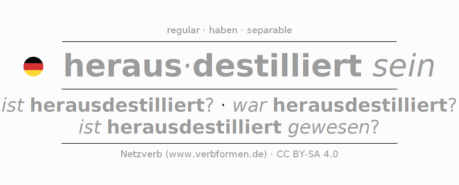 The conjugation of herausdestillieren in Participle Present Perfect part of speech Statal Passive is herausdestilliert seiend, herausdestilliert gewesen.The conjugation corresponds to certain grammatical rules. Likewise the requirements for the conjugation of the simple verb forms of herausdestillieren in Participle. Comments ☆