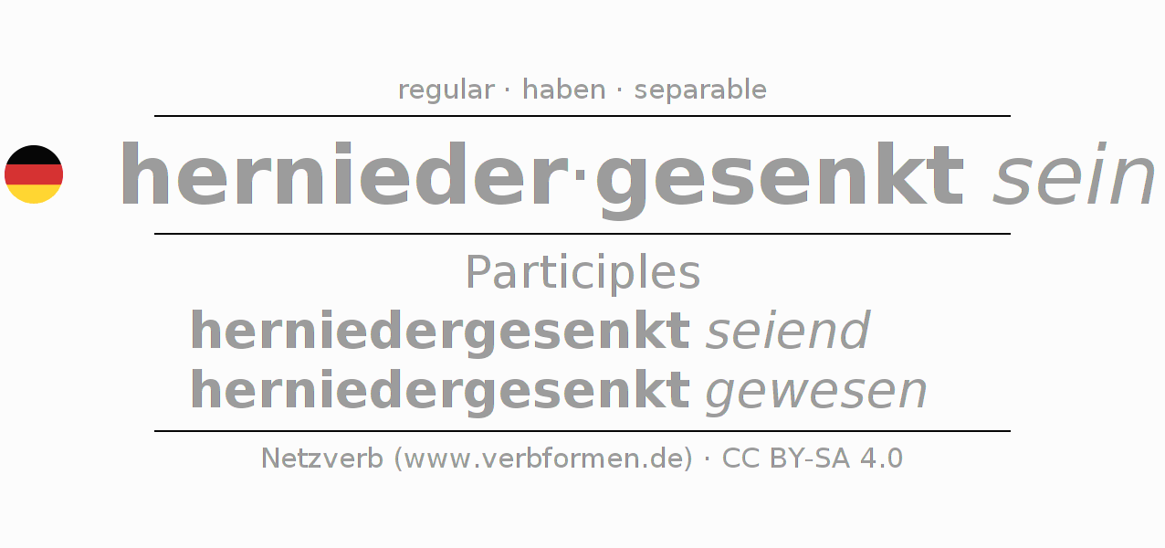 The conjugation of herniedersenken in Participle Present Perfect part of speech Statal Passive is herniedergesenkt seiend, herniedergesenkt gewesen.The conjugation corresponds to certain grammatical rules. Likewise the requirements for the conjugation of the simple verb forms of herniedersenken in Participle. Comments ☆