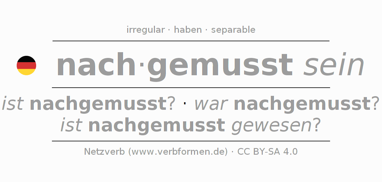 The conjugation of nachmüssen in Participle Present Perfect part of speech Statal Passive is nachgemusst seiend, nachgemusst gewesen.The conjugation corresponds to certain grammatical rules. Likewise the requirements for the conjugation of the simple verb forms of nachmüssen in Participle. Comments ☆