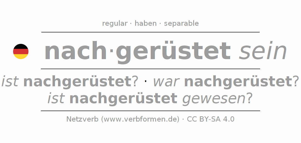 The conjugation of nachrüsten in Participle Present Perfect part of speech Statal Passive is nachgerüstet seiend, nachgerüstet gewesen.The conjugation corresponds to certain grammatical rules. Likewise the requirements for the conjugation of the simple verb forms of nachrüsten in Participle. Comments ☆