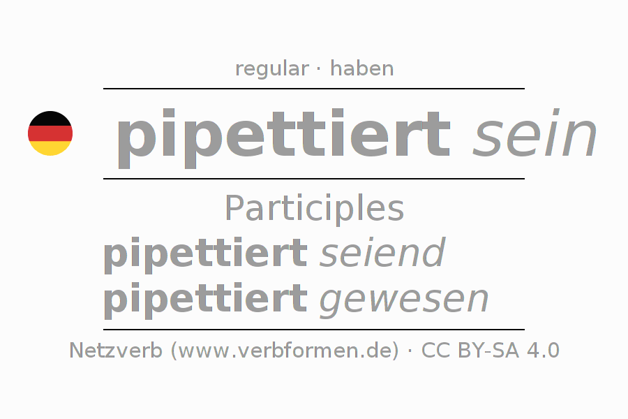 The conjugation of pipettieren in Participle Present Perfect part of speech Statal Passive is pipettiert seiend, pipettiert gewesen.The conjugation corresponds to certain grammatical rules. Likewise the requirements for the conjugation of the simple verb forms of pipettieren in Participle. Comments ☆