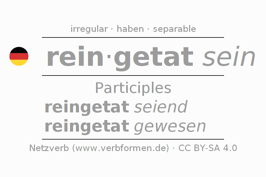 The conjugation of reintun in Participle Present Perfect part of speech Statal Passive is reingetat seiend, reingetat gewesen.The conjugation corresponds to certain grammatical rules. Likewise the requirements for the conjugation of the simple verb forms of reintun in Participle. Comments ☆