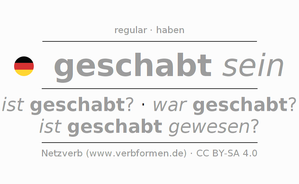 The conjugation of schaben in Participle Present Perfect part of speech Statal Passive is geschabt seiend, geschabt gewesen.The conjugation corresponds to certain grammatical rules. Likewise the requirements for the conjugation of the simple verb forms of schaben in Participle. Comments ☆