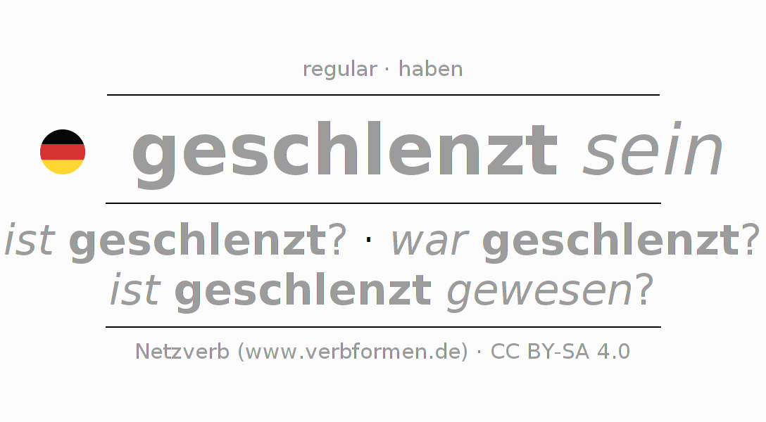 The conjugation of schlenzen in Participle Present Perfect part of speech Statal Passive is geschlenzt seiend, geschlenzt gewesen.The conjugation corresponds to certain grammatical rules. Likewise the requirements for the conjugation of the simple verb forms of schlenzen in Participle. Comments ☆