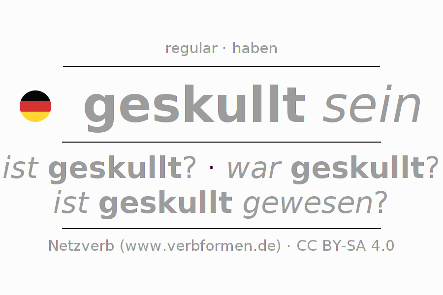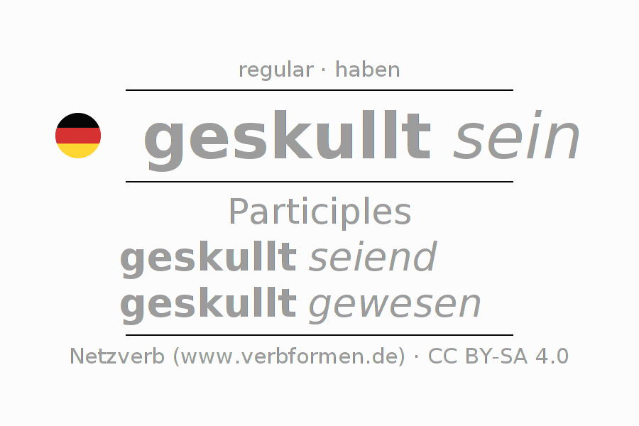The conjugation of skullen in Participle Present Perfect part of speech Statal Passive is geskullt seiend, geskullt gewesen.The conjugation corresponds to certain grammatical rules. Likewise the requirements for the conjugation of the simple verb forms of skullen in Participle. Comments ☆