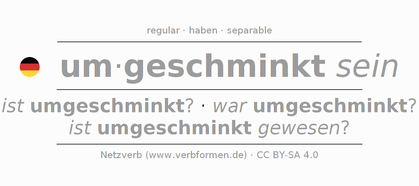 The conjugation of umschminken in Participle Present Perfect part of speech Statal Passive is umgeschminkt seiend, umgeschminkt gewesen.The conjugation corresponds to certain grammatical rules. Likewise the requirements for the conjugation of the simple verb forms of umschminken in Participle. Comments ☆