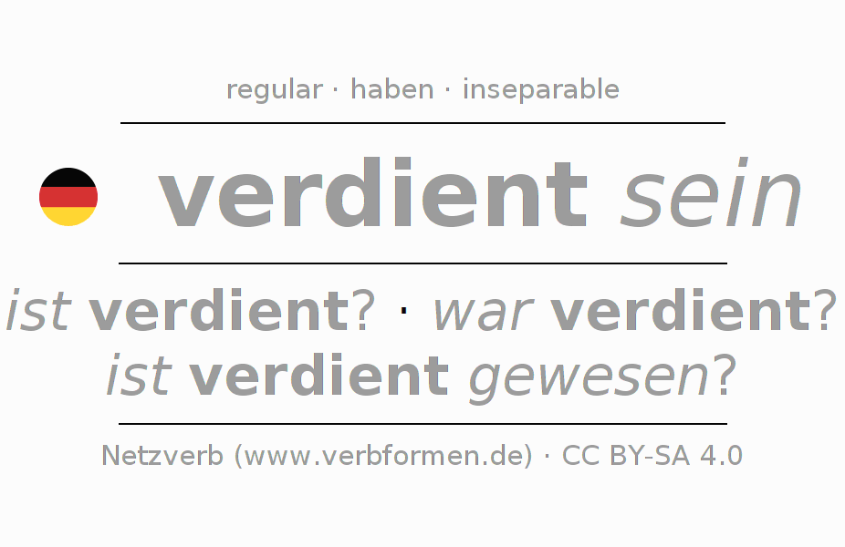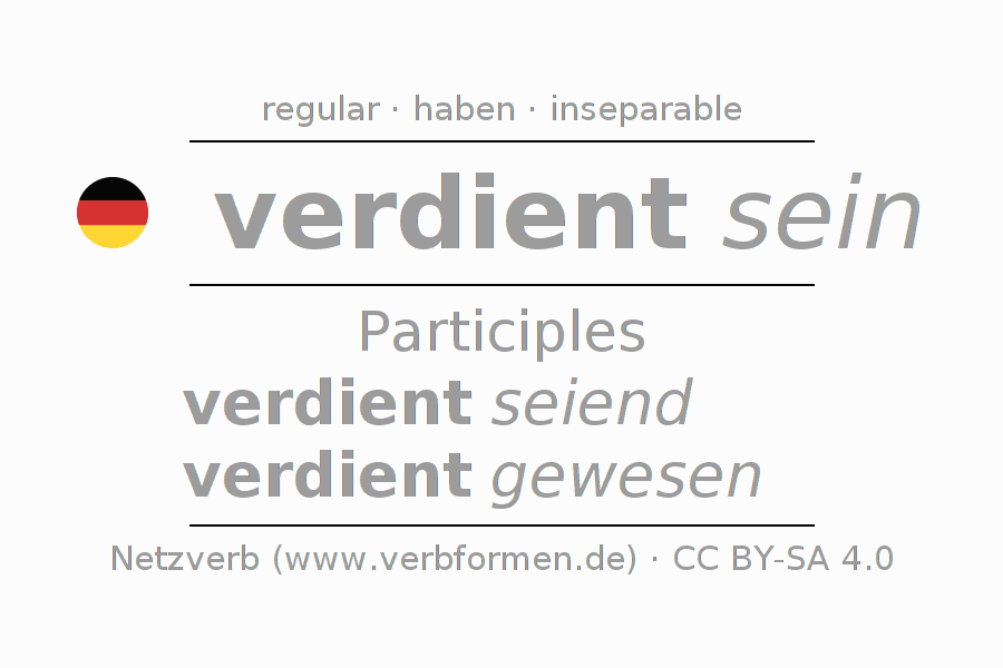 The conjugation of verdienen in Participle Present Perfect part of speech Statal Passive is verdient seiend, verdient gewesen.The conjugation corresponds to certain grammatical rules. Likewise the requirements for the conjugation of the simple verb forms of verdienen in Participle. Comments ☆