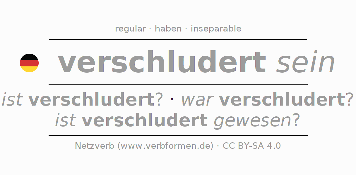 The conjugation of verschludern in Participle Present Perfect part of speech Statal Passive is verschludert seiend, verschludert gewesen.The conjugation corresponds to certain grammatical rules. Likewise the requirements for the conjugation of the simple verb forms of verschludern in Participle. Comments ☆