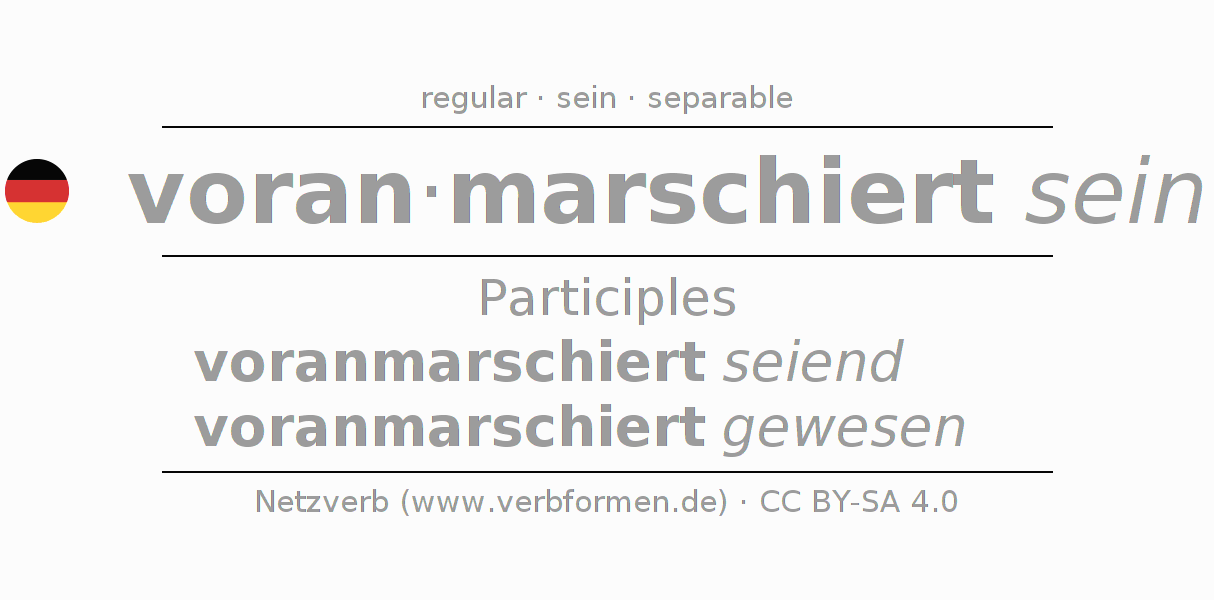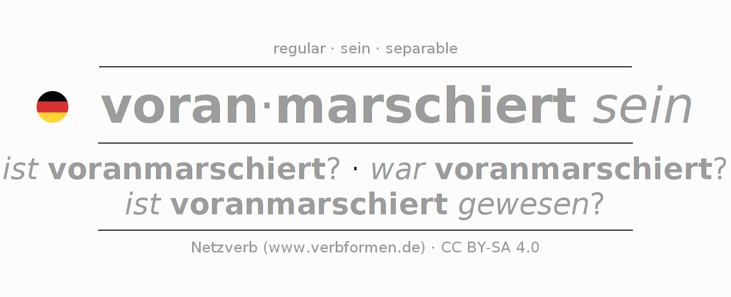 The conjugation of voranmarschieren in Participle Present Perfect part of speech Statal Passive is voranmarschiert seiend, voranmarschiert gewesen.The conjugation corresponds to certain grammatical rules. Likewise the requirements for the conjugation of the simple verb forms of voranmarschieren in Participle. Comments ☆