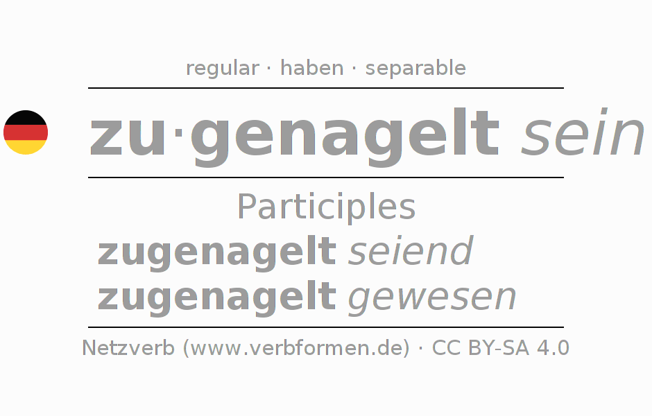 The conjugation of zunageln in Participle Present Perfect part of speech Statal Passive is zugenagelt seiend, zugenagelt gewesen.The conjugation corresponds to certain grammatical rules. Likewise the requirements for the conjugation of the simple verb forms of zunageln in Participle. Comments ☆