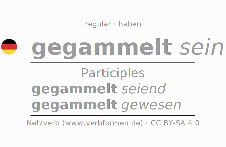 The conjugation of gammeln in Participle Present Perfect part of speech Statal Passive is gegammelt seiend, gegammelt gewesen.The conjugation corresponds to certain grammatical rules. Likewise the requirements for the conjugation of the simple verb forms of gammeln in Participle. Comments ☆