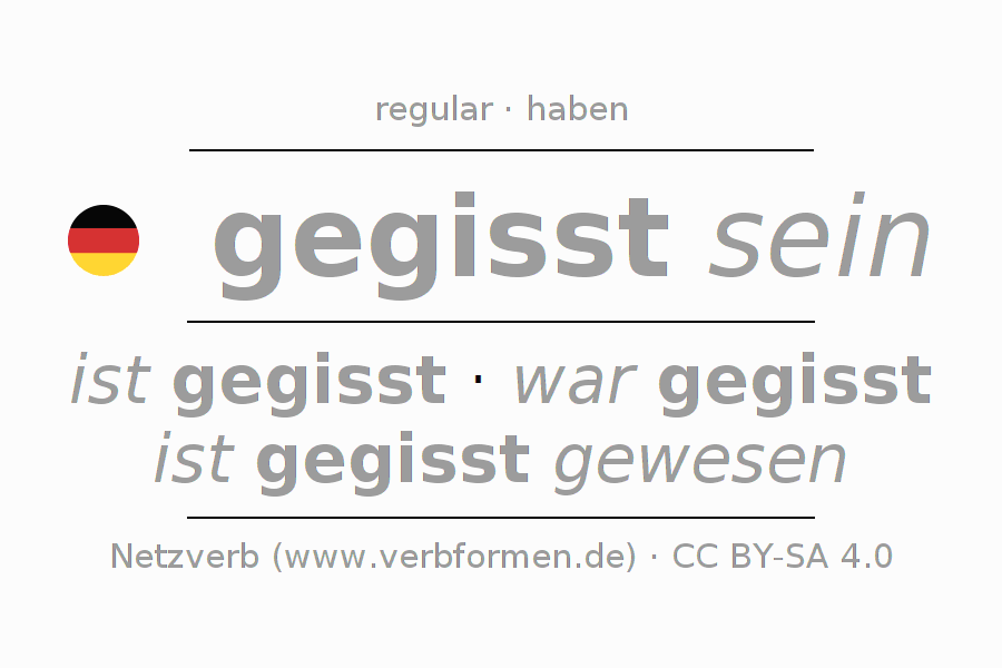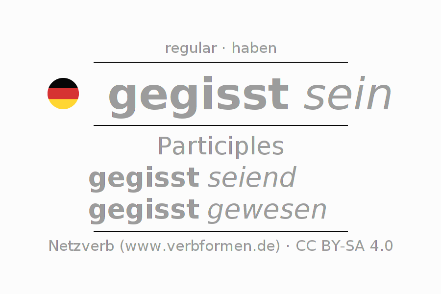 The conjugation of gissen in Participle Present Perfect part of speech Statal Passive is gegisst seiend, gegisst gewesen.The conjugation corresponds to certain grammatical rules. Likewise the requirements for the conjugation of the simple verb forms of gissen in Participle. Comments ☆