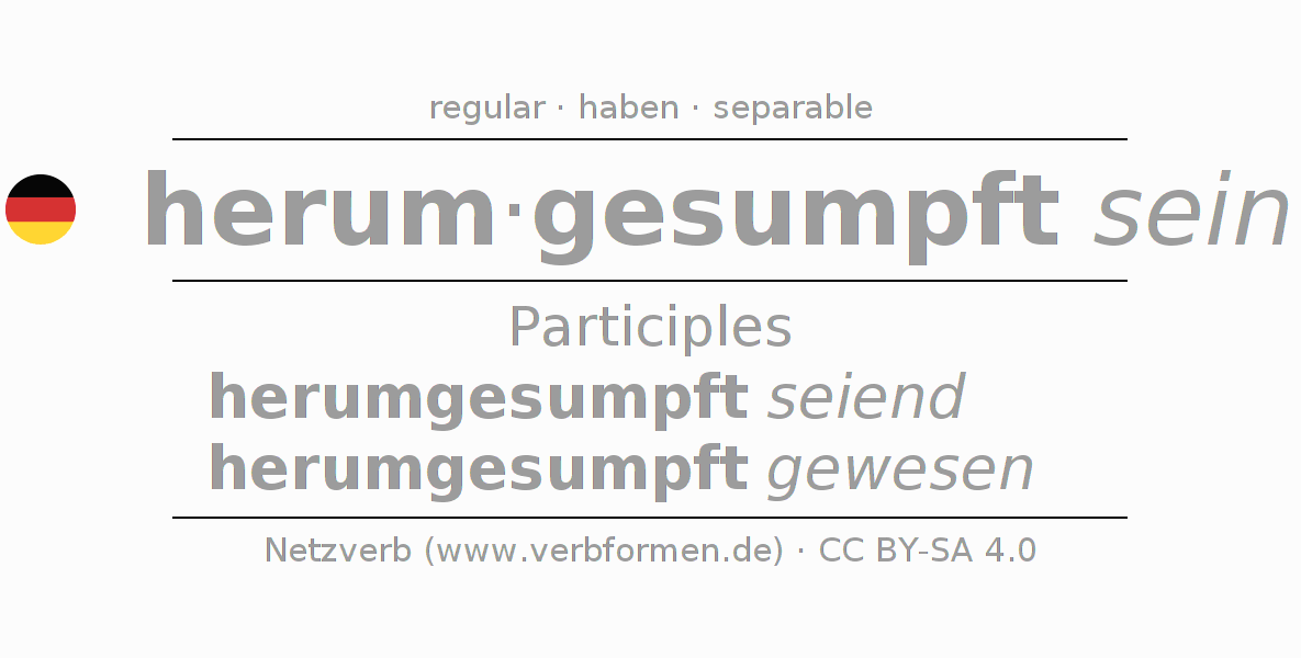 The conjugation of herumsumpfen in Participle Present Perfect part of speech Statal Passive is herumgesumpft seiend, herumgesumpft gewesen.The conjugation corresponds to certain grammatical rules. Likewise the requirements for the conjugation of the simple verb forms of herumsumpfen in Participle. Comments ☆