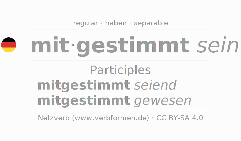 The conjugation of mitstimmen in Participle Present Perfect part of speech Statal Passive is mitgestimmt seiend, mitgestimmt gewesen.The conjugation corresponds to certain grammatical rules. Likewise the requirements for the conjugation of the simple verb forms of mitstimmen in Participle. Comments ☆