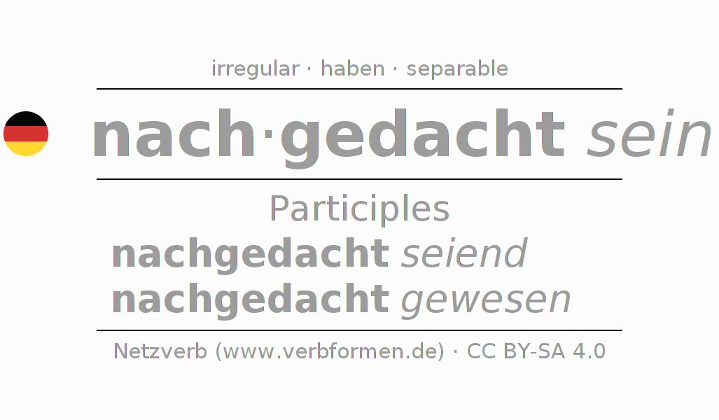 The conjugation of nachdenken in Participle Present Perfect part of speech Statal Passive is nachgedacht seiend, nachgedacht gewesen.The conjugation corresponds to certain grammatical rules. Likewise the requirements for the conjugation of the simple verb forms of nachdenken in Participle. Comments ☆