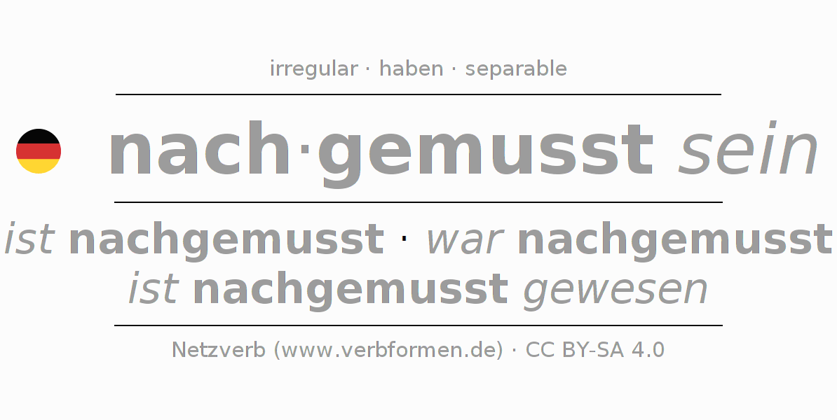 The conjugation of nachmüssen in Participle Present Perfect part of speech Statal Passive is nachgemusst seiend, nachgemusst gewesen.The conjugation corresponds to certain grammatical rules. Likewise the requirements for the conjugation of the simple verb forms of nachmüssen in Participle. Comments ☆
