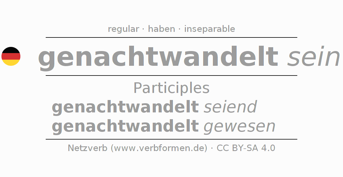 The conjugation of nachtwandeln in Participle Present Perfect part of speech Statal Passive is genachtwandelt seiend, genachtwandelt gewesen.The conjugation corresponds to certain grammatical rules. Likewise the requirements for the conjugation of the simple verb forms of nachtwandeln in Participle. Comments ☆