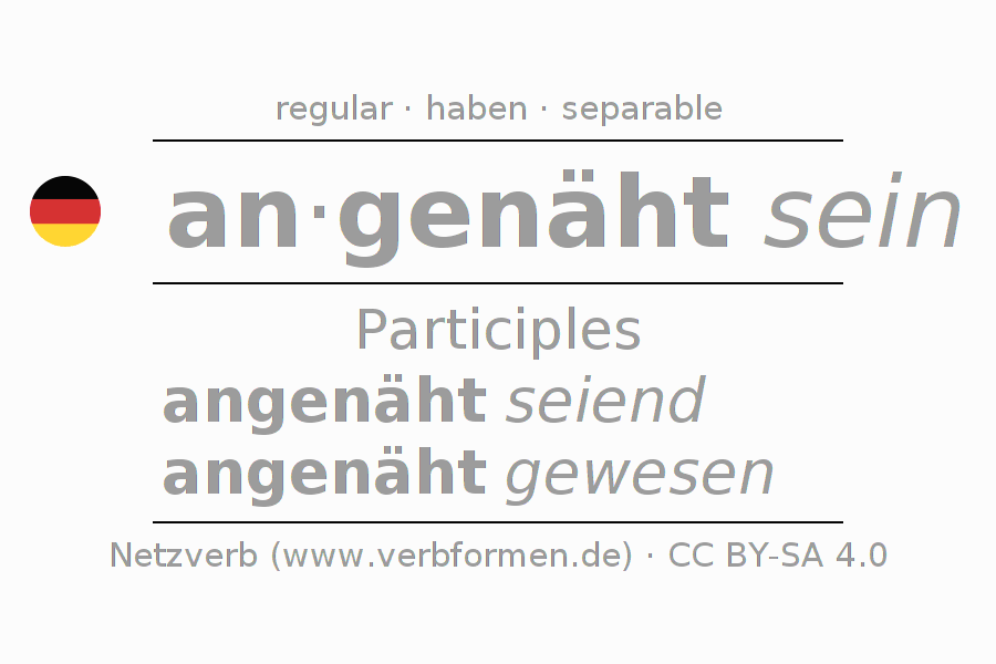 The conjugation of annähen in Participle Present Perfect part of speech Statal Passive is angenäht seiend, angenäht gewesen.The conjugation corresponds to certain grammatical rules. Likewise the requirements for the conjugation of the simple verb forms of annähen in Participle. Comments ☆