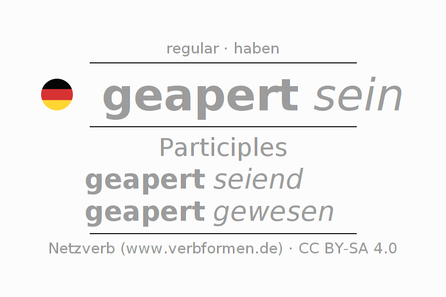 The conjugation of apern in Participle Present Perfect part of speech Statal Passive is geapert seiend, geapert gewesen.The conjugation corresponds to certain grammatical rules. Likewise the requirements for the conjugation of the simple verb forms of apern in Participle. Comments ☆